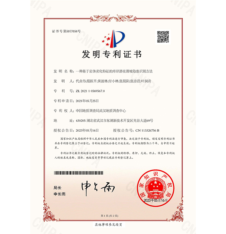 中国地质调查局武汉地质调查中心“一种基于岩体劣化特征的库岸潜在滑坡隐患识别方法”获国家发明专利授权