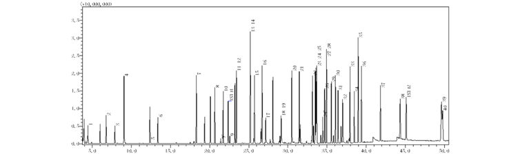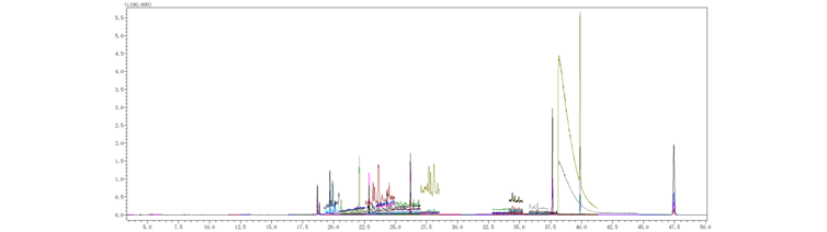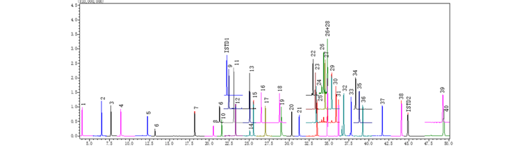 图4. 40种香料组分标准溶液MRM色谱图(20 mg/L)