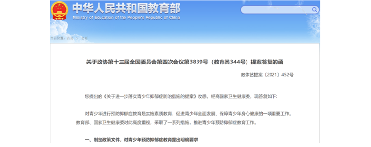 《中国国民心理健康发展报告(2019-2020)》显示,18至34岁青年是成人中最焦虑的群体,我国青少年抑郁检出率为24.6%,其中重度抑郁为7.4%;2021年教育部对政协《关于进一步落实青少年抑郁症防治措施的提案》进行了答复,其中明确将抑郁症筛查纳入学生健康体检内容,建立学生心理健康档案,评估学生心理健康状况,对测评结果异常的学生给予重点关注。