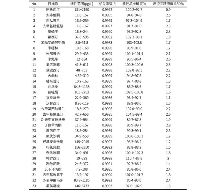 采用同位素内标蛋白沉淀法提取人血清中33种抗抑郁药物,通过LC-MS/MS内标法定量分析。2 μL进样量下即可满足33种抗抑郁药LOD 0.02~8 μg/L,各化合物线性相关系数r>0.9990,质控品准确度在86%~111%内,精密度RSD(n=6)在0.9%~2.9%内,分析性能均满足临床检测要求。