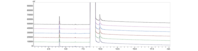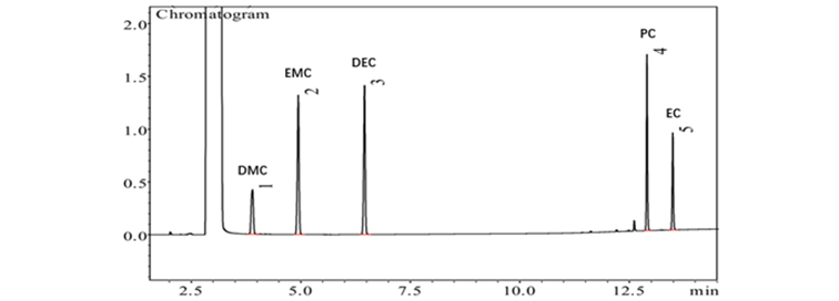 电解液中碳酸酯类溶剂主要有碳酸乙烯酯(EC)、碳酸丙烯酯(PC)、碳酸二甲酯(DMC)、碳酸二乙酯(DEC)、碳酸甲乙酯(EMC)和碳酸亚乙烯酯(VC)等。岛津推荐采用GC-FID对已知电解质溶剂的常规定量检测,GCMS用于电解液中未知溶剂和不纯有机物中杂质的定性、定量检测。