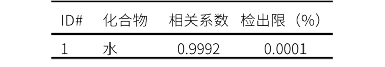 使用DMC配制标准溶液,含水量分别为 0.001、0.005、0.01、0.05、0.1%,进样分析制作标准曲线,以0.001%标准溶液响应值计算仪器检出限。