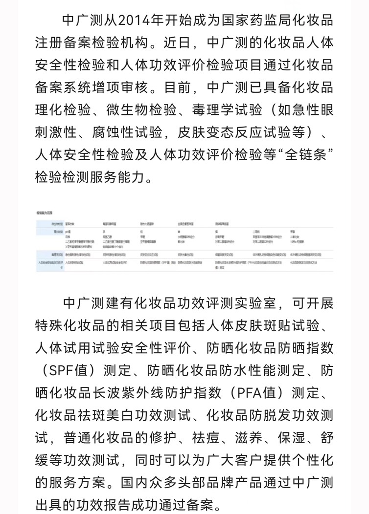 中广测化妆品功效评价已通过国家化妆品备案系统增项审核