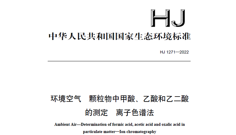 为贯彻《中华人民共和国环境保护法》《中华人民共和国大气污染防治法》,防治生态环境污染,改善生态环境质量,生态环境部组织制定了《HJ 1271-2022 环境空气 颗粒物中甲酸、乙酸、乙二酸的测定 离子色谱法》,规范环境空气颗粒物中甲酸、乙酸和乙二酸的测定方法。