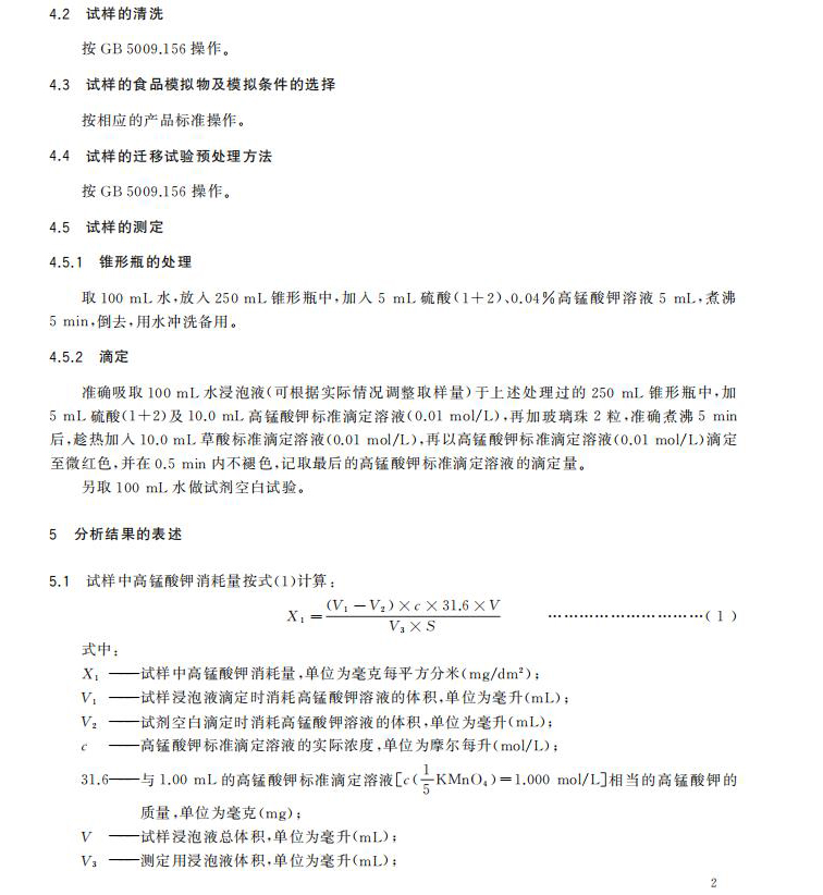 GB 31604.2-2016 《食品安全国家标准 食品接触材料及制品 高锰酸钾消耗量的测定》主要内容: