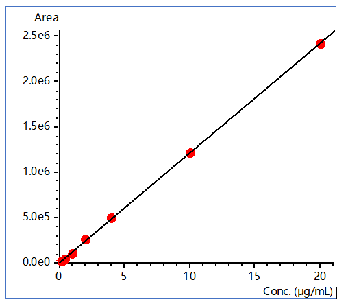 GCMS法具有更高的灵敏度,环氧乙烷标准曲线浓度范围为0.2 ~ 20 μg/mL,标准曲线如下图,线性相关系数R为0.9999,线性关系良好。