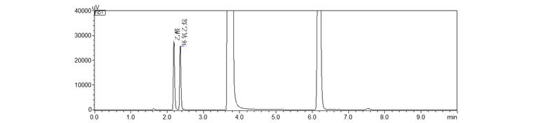 药包材中聚对苯二甲酸乙二醇酯(PET)材料的分解有可能产生乙醛,因此环氧乙烷和乙醛有可能同时存在于同一产品中,它们在色谱柱上的保留行为相近,二者需要完全分离,才能对环氧乙烷准确定量。实验结果表明,环氧乙烷和乙醛分离度为2.687,两化合物完全分离,满足公示稿的系统适应性要求。(分离情况见下图)。