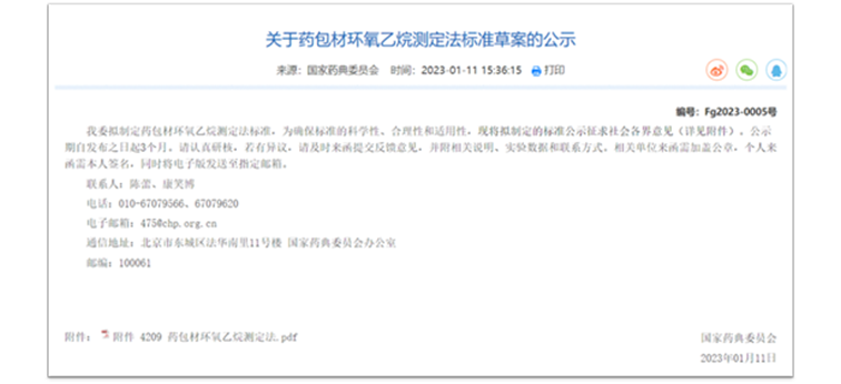 2023年1月,国家药典委员会发布了4209《药包材环氧乙烷测定法》公示稿,用于检测经过环氧乙烷灭菌的预灌封注射器组合件、滴眼剂瓶等药品包装材料中环氧乙烷残留量。