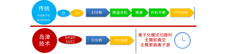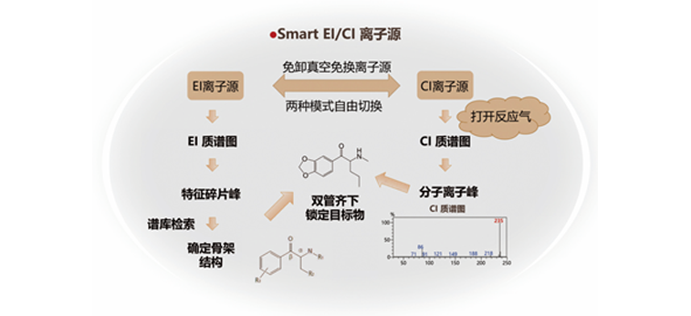 相对于EI源来说,CI源需要额外的甲烷、异丁烷等反应剂气体在离子源内电离,与目标化合物发生分子-离子反应,因此传统的离子源都是独立的EI源和CI源,需要更换离子化模式时就需要卸除真空进行硬件的更换,众所周知更换过程以及真空系统的稳定需要很长的时间,这就给实验工作带来非常大的不便,岛津Smart EI/CI复合离子源应运而出,巧妙的设计在保证EI源灵敏度不受影响的前提下轻松实现一个离子源EI和CI两种离子化模式无缝切换,满足不同领域客户定性和定量需求。接下来让我们一起来认识下吧!