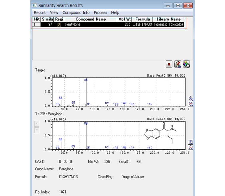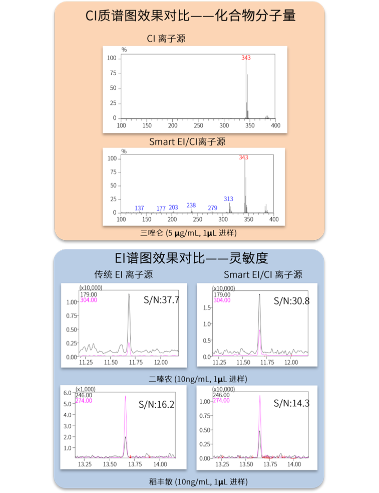 通过CI模式获得分子离子峰确定目标化合物分子量,再通过比对EI模式获得相似度检索的定性结果加强鉴定的准确性。