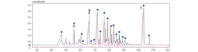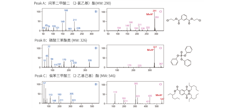 电子电器和日常用品使用的树脂材料,常使用各种添加剂以提高材料的稳定性和耐久性,近年来RoHS、REACH等加强了对有害人体健康的化学物质的限制,严格控制树脂材料中的添加剂。通常情况下EI离子化法不会得到这些添加剂组分的分子离子峰,复杂的基质情况很难对待测组分进行准确的定性,因此结合CI离子化模式加强鉴定结果就显得尤为重要了。使用Smart EI/CI复合源通过简单的方法切换轻松获取EI和CI数据,不仅提高了定性识别的准确性,更大幅度提高了分析过程效率。