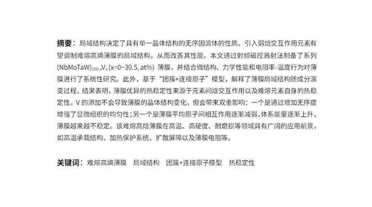 【导读】合金与金属相比,除具有金属的特性外,还具有许多比单组分金属更优良的物理、化学或机械性能,如硬度大、密度低、耐磨、耐腐蚀等,因而广泛应用于人们的衣食住行以及航空、航天、机械制造、船舶等领域。合金的性能可以通过所添加的元素种类、含量以及合成条件等来加以调控。近期,大连理工大学李晓娜教授团队通过射频磁控溅射法制备了一系列 (NbMoTaW)100-xVx (x = 0 ~ 30.5, at%) 合金薄膜,探究了由弱焓相互作用元素V引起的局域结构转变对NbMoTaW体系性能的影响,揭示了高熵合金薄膜的高稳定性不仅源于元素本身的高熔点,而且与高无序程度和焓相互作用引起的微观结构波动有关,有望在高温、高硬度、耐磨损等条件下得到广泛应用。