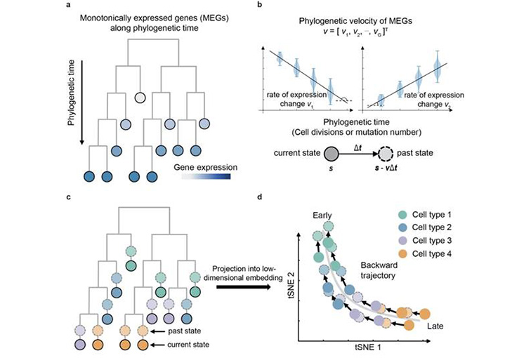 在本文中,作者提出利用单细胞系统发育树的枝长信息代替物理时间,联合单细胞转录组数据,可以研究基因表达随着枝长(即时间)的变化规律,特别是鉴定随细胞分裂而表达量呈单调递增或递减的基因(即单调表达基因),其RNA变化速度可以利用分子演化模型进行定量估计,从而构建单细胞转录组速度场,实现对细胞分化轨迹的高精准推断(图1)。