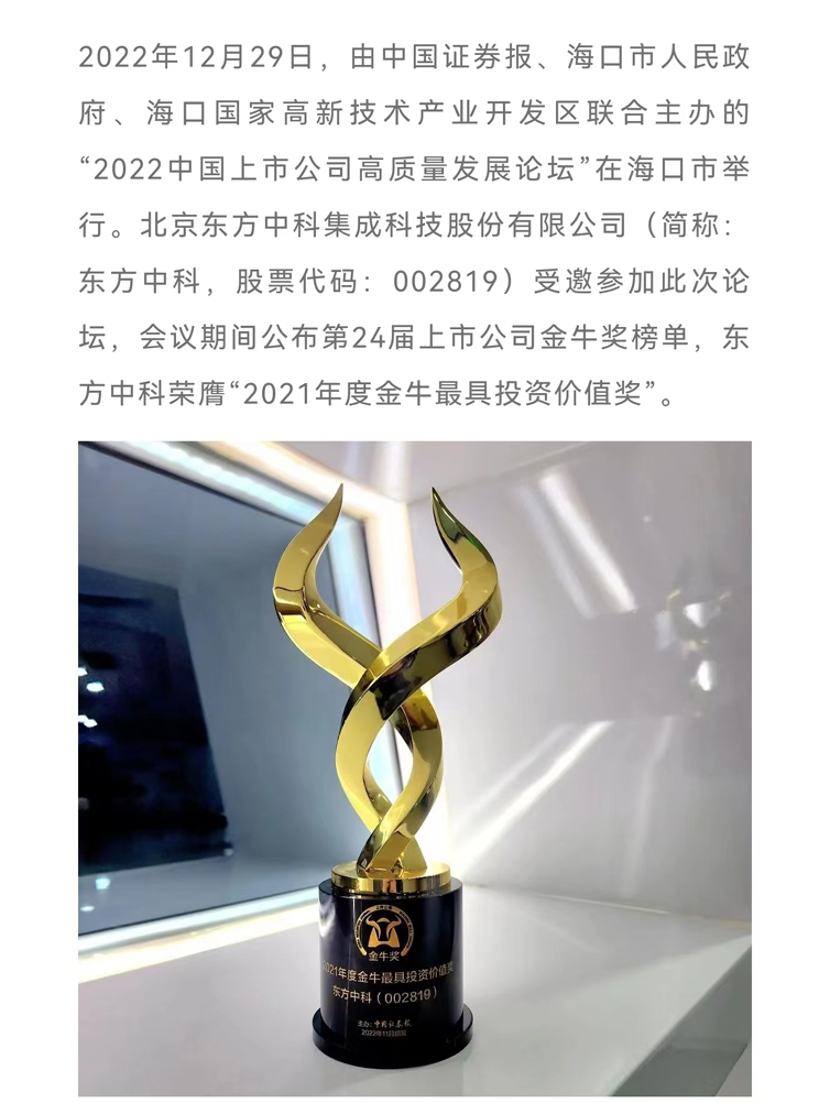 东方中科荣膺“2021年度金牛最具投资价值奖”