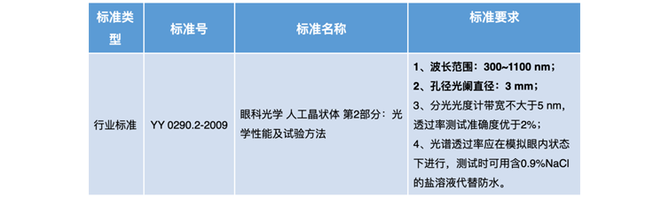 中国医药行业标准YY 0290.2-2009《眼光科学 人工晶状体 第2部分:光学性能及试验方法》规定了对于人工晶状体透光性能的要求,具体要求见表1。