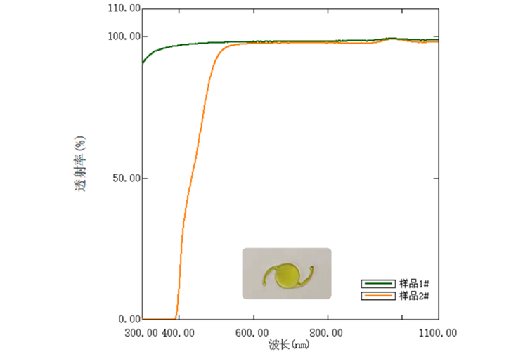 采用岛津紫外可见分光光度计UV-2600i、积分球附件ISR-2600Plus以及该人工晶体支架对两种品牌的人工晶体样品的透过率进行了检测。测试时,支架中充满0.9%NaCl盐溶液。