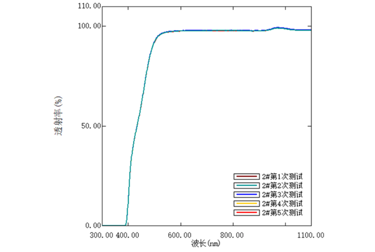 为了考察该人工晶体支架测试的重复性,对2#样品进行5次测量,每次测试需要拆开支架重新装样,以验证人工晶体支架对于样品定位的准确性,重复性测试光谱见图6。从结果上看,5次测试的光透过率数据重复性较好,说明设计的人工晶体支架能够将人工晶体样品准确固定在定位孔中。