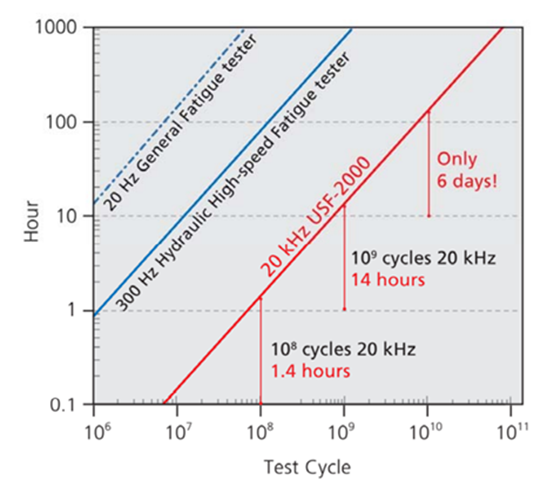 下图是不同频率的试验机完成固定周次的疲劳试验所要花费的时间,可以看出:如106周次的试验,普通试验机20Hz的测试频率需要十多个小时,300Hz测试频率的疲劳试验机需要1个小时;而107周次的试验,20Hz测试频率需要数百小时,300Hz测试频率需要8-9个小时,而20 kHz几分钟即可完成;如109周次这种普通伺服疲劳试验机很难完成的实验,USF也仅需14个小时即可完成。