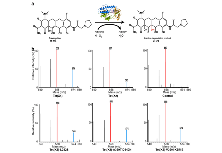(a) Tet(X)降解伊拉瓦环素的模型图 (b)基于MALDI-TOF的单加氧产物的质谱测定