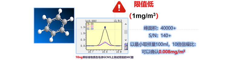 有些客户会关注一些限值较低的组分,最常见的就是苯。苯毒害性大,排放限值低(1mg/m3)。为了排除可能存在的误判情况,可以借助GCMS定性定量测试。10ng苯在GCMS测试结果如图所示,在100ml最小取样量,10倍信噪比定量限下,数据可以确认到0.01 mg/m3左右。借助GCMS远低于排放限值的测试能力,帮助我们确认现场是否存在误判数据。