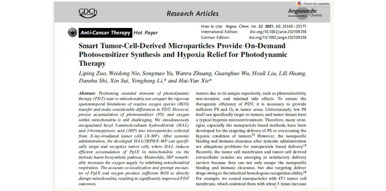 我们与北京理工大学谢海燕团队左立萍博士针对此方法,从光和氧这两个因素进一步探索完善,从而增强了PDT效果,使PDT在临床上发挥更明显的作用,研究成果发表在《Angewandte Chemie》上。