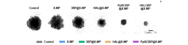 图1. HAL/3BP@X-MP的体外细胞毒性:不同药物处理3天后多细胞肿瘤的球体3D图片