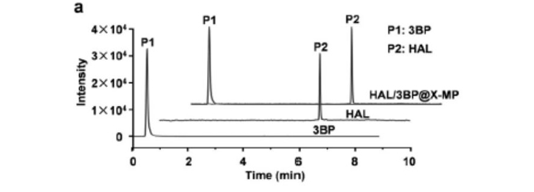 在此研究过程中,需要测定X射线照射的X-MP中的HAL和3BP的封装率,但由于分光光度法及液相色谱法的灵敏度无法满足检测需求,且有基质干扰,因此选用岛津LCMS-8045完成了封装率的测定——岛津LCMS-8045拥有最快30000U/S的扫描速度和5 msec超快速的正负极性切换功能,具有远高于紫外检测器的灵敏度,可实现对痕量HAL和3BP的定性、定量、正负离子同时检测。