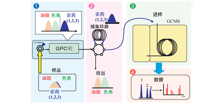 GPC是按照分子量(尺寸)的大小进行分离,通过切换阀先排出GPC洗脱时间快的油脂、蛋白、色素、类固醇等大分子,然后将分析对象农药及其他小分子基体物质导入捕集环路,通过大体积进样口浓缩进入气相色谱质谱联用系统进行检测。