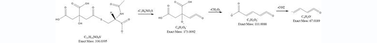 枸橼酸是乙酰半胱氨酸辅料中的一种,作为泡腾崩解剂起到加速药物溶解和吸收的作用。根据客户提供的生产工艺,枸橼酸与乙酰半胱氨酸加水混合后湿法制粒。在湿法制粒过程中加水量与未知杂质的含量正相关。因此推测未知杂质是枸橼酸与乙酰半胱氨酸脱水缩合而成,可能的裂解规律见图3。