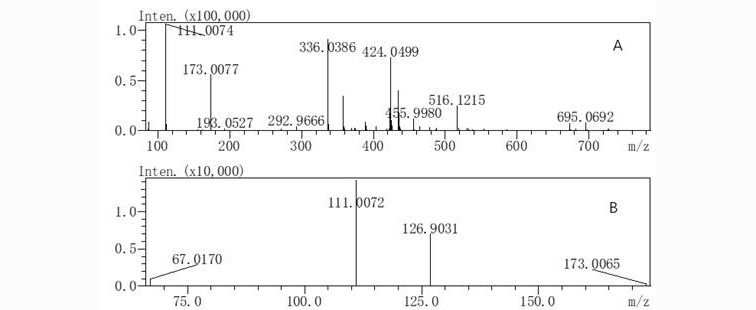 图2未知杂质的MS(A)和母离子m/z 336的MS2(B)质谱图(ESI-)