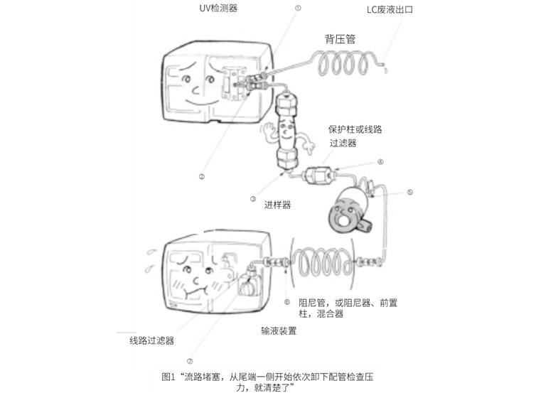 首先,卸下图1中的接头①(检验背压管)进行输液。如果压力下降(100KPa以上),则是背压管堵塞。如果压力未下降再往上流找堵塞的地方,卸下一个接头②(检验检测器),进行检查。同样地依次检查、③(分析柱)、④(保护柱或线路过滤器)、⑤(进样器)、⑥(阻尼管,前置柱)等、⑦(输液装置的线路过滤器)等。
