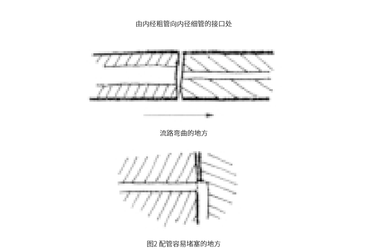 在流路中最容易堵塞的地方是配管管道,尤其是由内径粗的管向细的管的接缝处,或流路拐弯处(图2)。