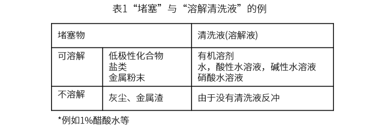如果确定是流路中的堵塞,有的可以溶解洗净,有的不能洗净(表1)应采取反向清洗或更换配管部分。