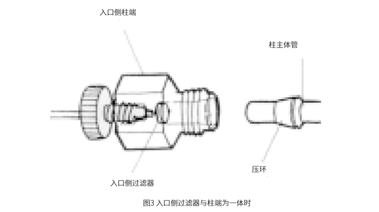 ② 检查入口侧柱端的压力(图3在过滤器与柱端为一体时)。压力高时,用超声波清洗,如不能改善,更换柱端过滤器。
