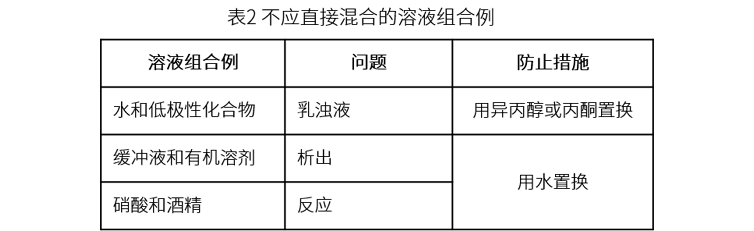 流动相和样品溶液,特别是样品溶液一定要经膜滤器过滤。然后,将梯度洗脱溶液混合,以及将流动相与样品溶液混合确认是否有不溶物产生。