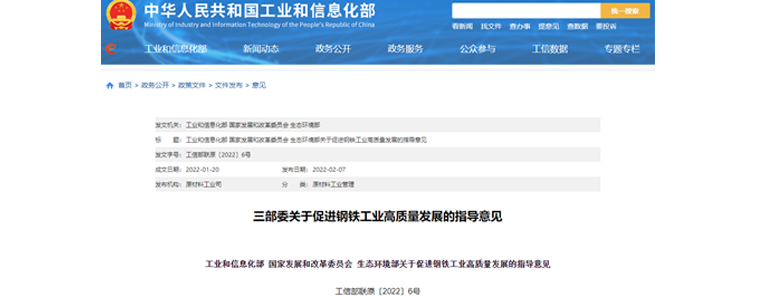 2022年2月,工业和信息化部、国家发展和改革委员会、生态环境部三部委联合发布《关于促进钢铁工业高质量发展的指导意见》,其中着重强调了“钢铁工业是国民经济的重要基础产业,是建设现代化强国的重要支撑,是实现绿色低碳发展的重要领域。“十四五”时期,我国钢铁工业仍然存在产能过剩压力大、产业安全保障能力不足、绿色低碳发展水平有待提升、产业集中度偏低等问题。”可以预见,在新的政策下,高质量发展仍是现阶段钢铁行业发展的重要目标,从追求产量增加向追求质量提高与追求绿色低碳环保发展。落实钢铁行业碳达峰实施方案,统筹推进减污降碳协同治理,提升高质量发展水平。