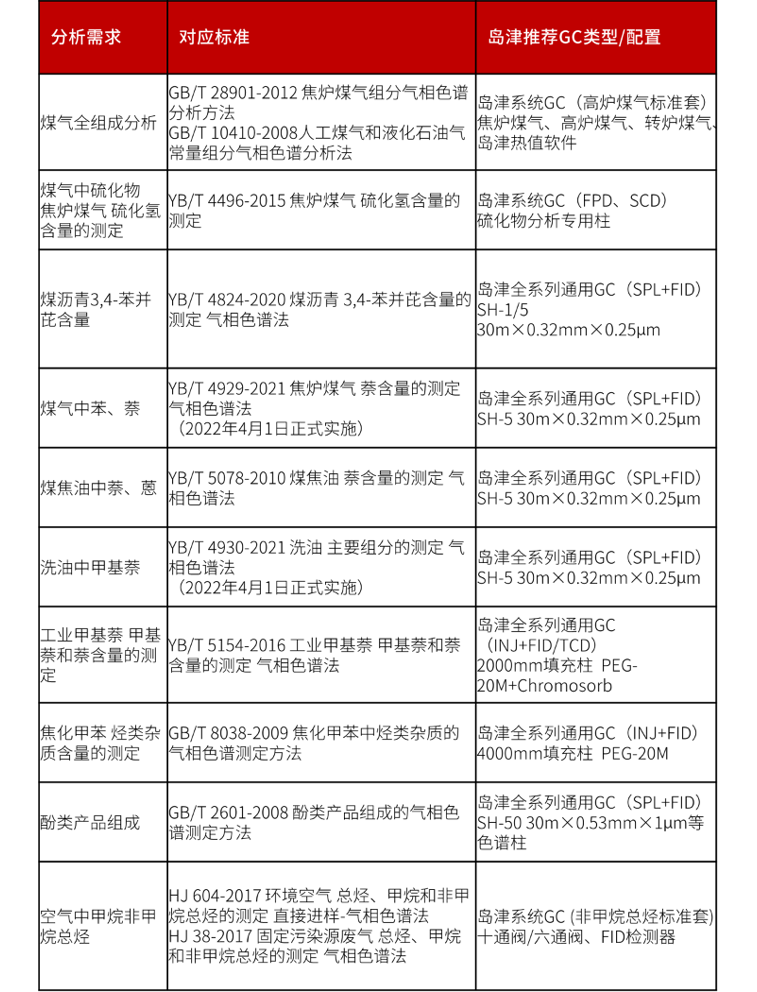 岛津气相色谱仪在钢铁冶金行业中应用非常广泛,具体涉及到煤气、粗苯、焦油加工产品、焦化废水等多方面,尤其是焦化工业中。相关需求可以大致分为三类: