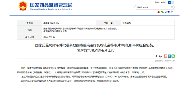 1月29日,我国两款口服小分子新冠病毒感染治疗药物——民得维、先诺欣,分别通过国家药品监督管理局特别审批程序,附条件获批上市,用于治疗轻中度新型冠状病毒感染的成年患者。