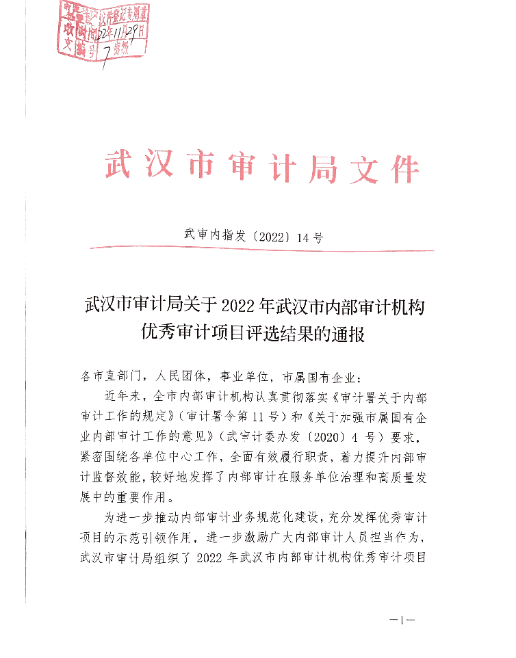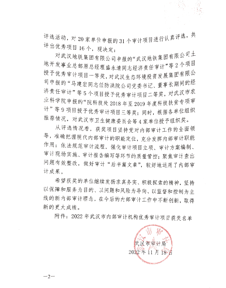 近日,武汉市审计局组织了2022年武汉市内部审计机构优秀审计项目评选活动,共评出优秀项目16个,市农科院审计处申报项目“2018年至2019年度科技扶贫专项审计”获优秀审计项目三等奖。