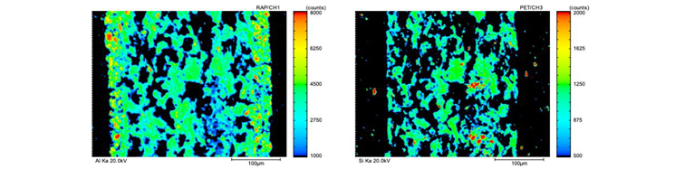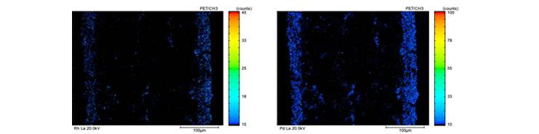 出于成本考虑,贵金属活性成分一般含量很低,所以在测试时对仪器的灵敏度要求较高,同时由于添加的稀土元素特征X射线峰位之间非常接近,一般的能谱仪(EDS)也不足以满足能量分辨率的需求,岛津电子探针对此类样品的测试有着足够的优势,同时满足灵敏度和分辨率的测试要求。