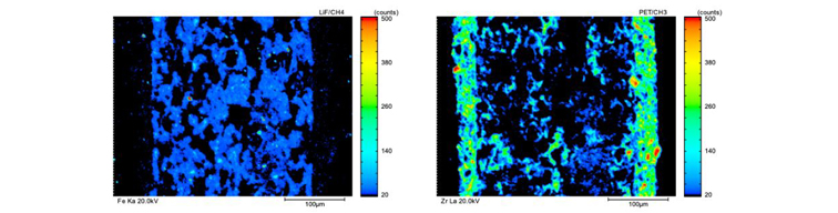 使用岛津电子探针对汽车尾气颗粒捕捉器GPF试样进行了观察和解析,确认了其具有涂覆层的结构。结果显示GPF载体为有一定孔隙度的硅铝酸盐陶瓷材料,而涂覆层含有La、Ce等稀土和Rh、Pd等贵金属活性成分,具有三元催化效用。岛津电子探针兼具高灵敏度、高分辨率特性,可对GPF微观结构进行有效表征。