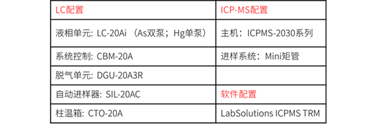 基于LC-ICP-MS仪器,提供梯度洗脱色谱条件和LabSolutions ICPMS TRM软件参数,可实现六种砷形态的高效分离检测。