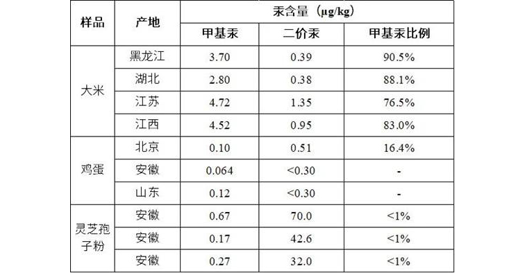 表1 不同产地大米、鸡蛋、灵芝孢子粉中汞形态分析结果