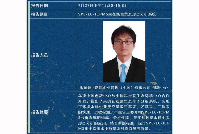岛津赞助参加第十一届全国环境化学大会,将在第27地表水污染防治与生态修复分会场,由创新中心朱留超博士介绍SPE-LC-ICPMS汞在线富集及形态分析系统,欢迎大家莅临参加。