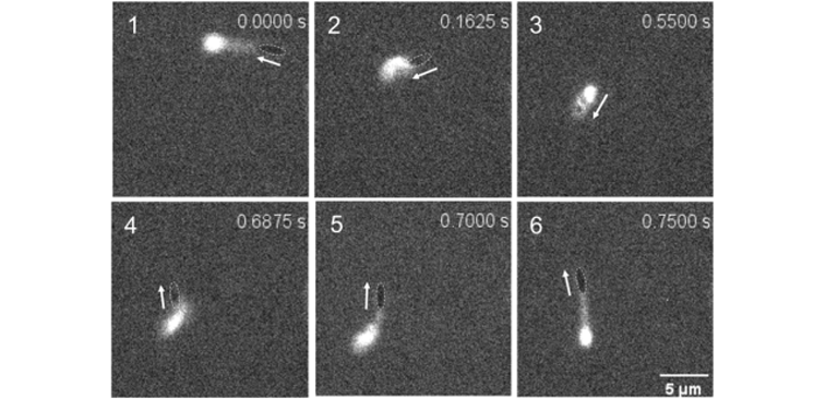 图1.细菌游动的明场及荧光图像。虚线代表细菌胞体,亮色代表荧光标记的鞭毛丝,白色箭头代表细菌游动方向。