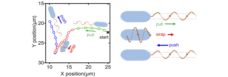 图2. 铜绿假单胞菌游动新模式。(左)图1细菌的游动轨迹示意图,不同颜色代表不同游动模式。(右)三种游动模式下鞭毛丝的状态。