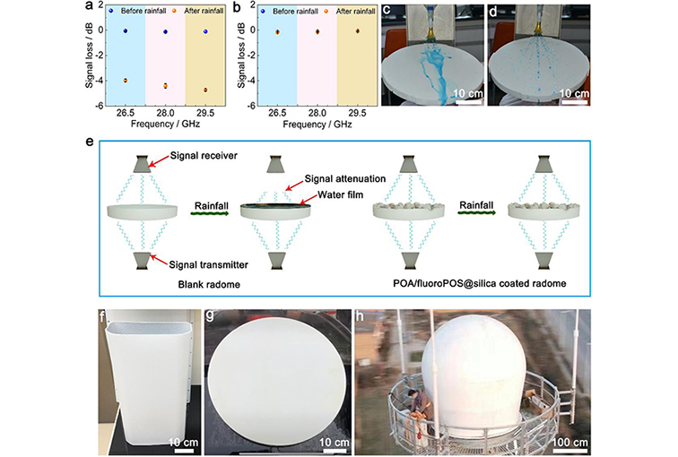 5G技术是我国重大战略布局。目前,中国已建成全球最大5G网络,需大量5G基站支撑。5G天线罩是5G基站的重要组成部分(图1a),用来保护天线系统免受外界复杂环境干扰,提高天线精度和使用寿命。5G信号目前采用<6 GHz频段,未来将使用30-300 GHz毫米波(图1b)。因此,5G信号易受外部干扰,尤其是“雨衰效应”。降雨时,雨水会在5G天线罩表面形成水滴或水膜。由于介电常数很高(~80,25℃),水会吸收、反射大量电磁波,导致5G信号严重衰减。