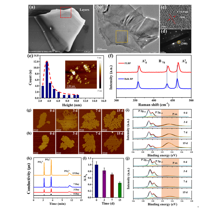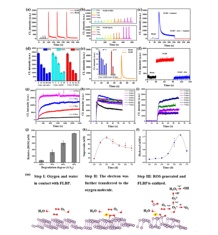 基于此,研究者合成了黑磷纳米片,系统研究了其黑暗条件下氧化降解的过程。在此过程中意外地发现即使在没有光照的情况下,黑磷纳米片的自降解也伴随着活性氧的持续产生。且随着贮存时间的延长,黑磷纳米片降解及其活性氧生成的程度越高。