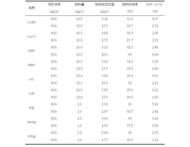 对于以上6种形态砷和3种形态汞的定量来说,HPLC-ICPMS联用是常用的分析方法,其中,LC的分离条件是关键。