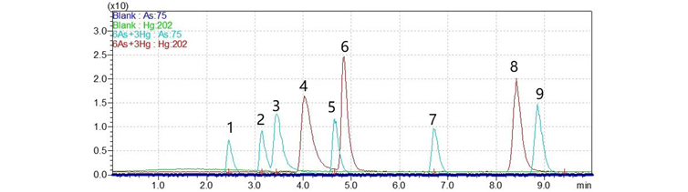 元素形态的分离是大家关心的永恒问题,让我们一起看看6种形态砷和3种形态汞在一针进样的条件下分离情况如何吧: